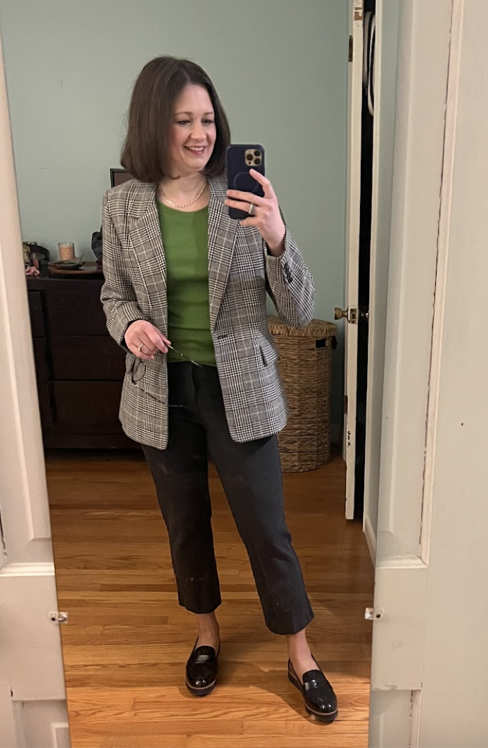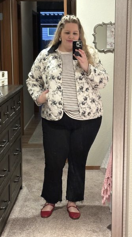 My preppy, romantic side loved this outfit! I liked the pattern mixing with the top and jacket. I added a pop of color in with my red mary jane flats. I also tried this jacket with a chambray button up under and it was really cute too.