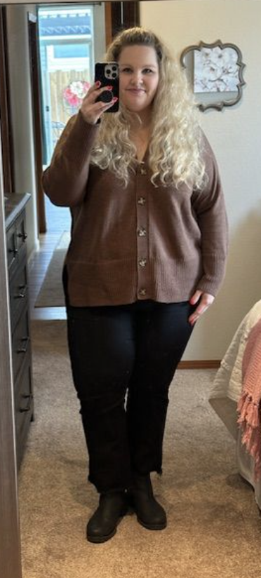 I’m getting anxious to start wearing some spring things, but weather where I live won’t start to warm up for a while longer. So, switching up how I wear this cardigan gave me a new way to wear it. Instead of wearing it open with a tank under, I buttoned it and paired it with black jeans instead of blue.
