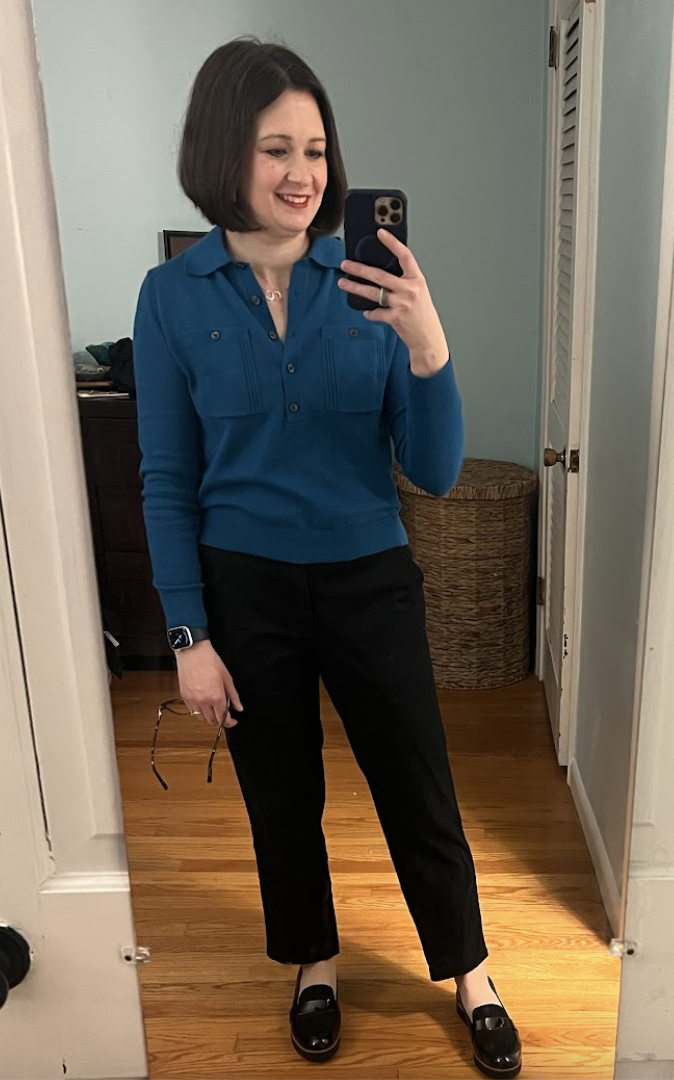 A lightweight polo sweater is a great piece for preppy gals in the spring seasonal transition. Choose a pop of color and pair with jeans, chinos (like I have here), or dress pants and a loafer and you are done! I wore this to work on a Friday.