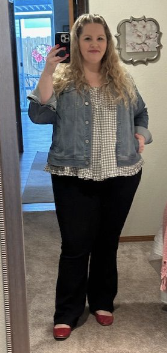 I recently got this top, but it's still too cold to wear without a layer. I added my trusty denim jacket and it worked perfect! My red mary jane flats, the pattern and the ruffle on the hem of the shirt are all speaking to my romantic style. The denim jacket keeps it causal and the bootcut jeans are working great for my bottom curvy shape. I felt great in this outfit and wore it a couple of times this month.