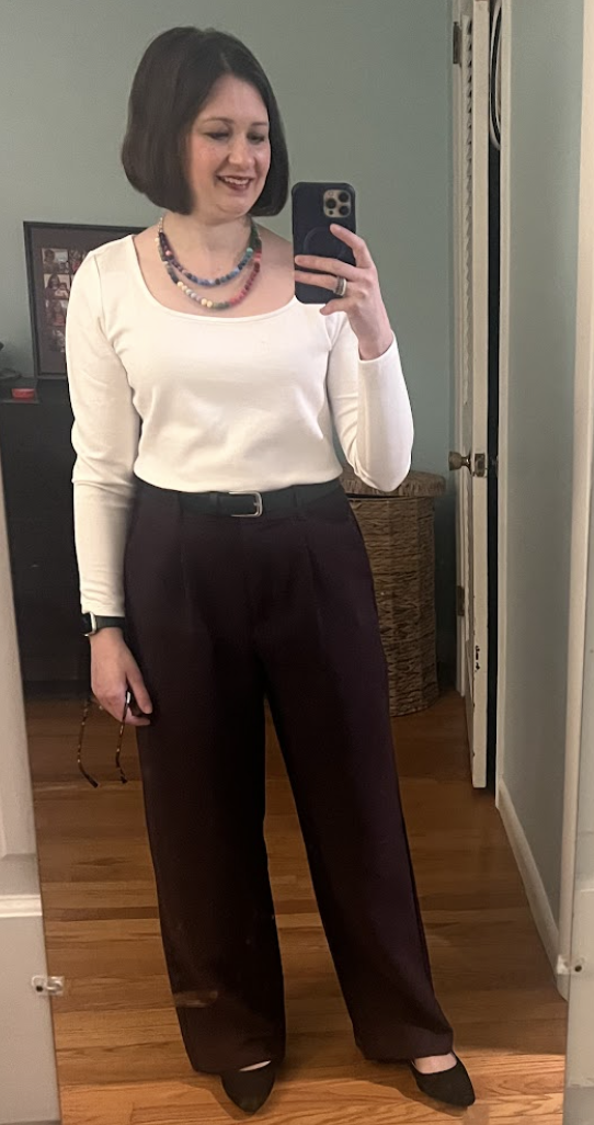 A simple but polished work look. This top is as comfy as a tee but has a nice silky texture, and it’s thicker! Great to wear alone or as a layer. These wide leg trousers might look familiar—I have them in several colors!