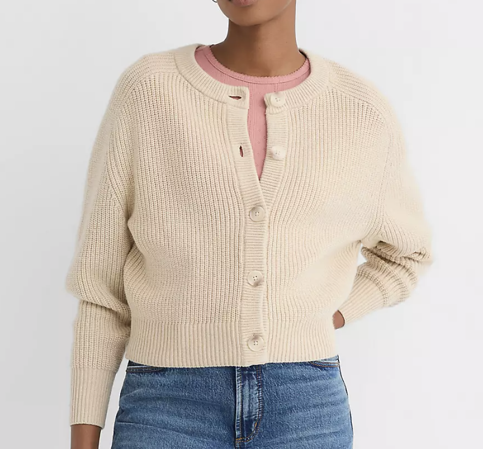 Outfit Building Blocks; cardigan + basic knit + dress pant + dress shoe